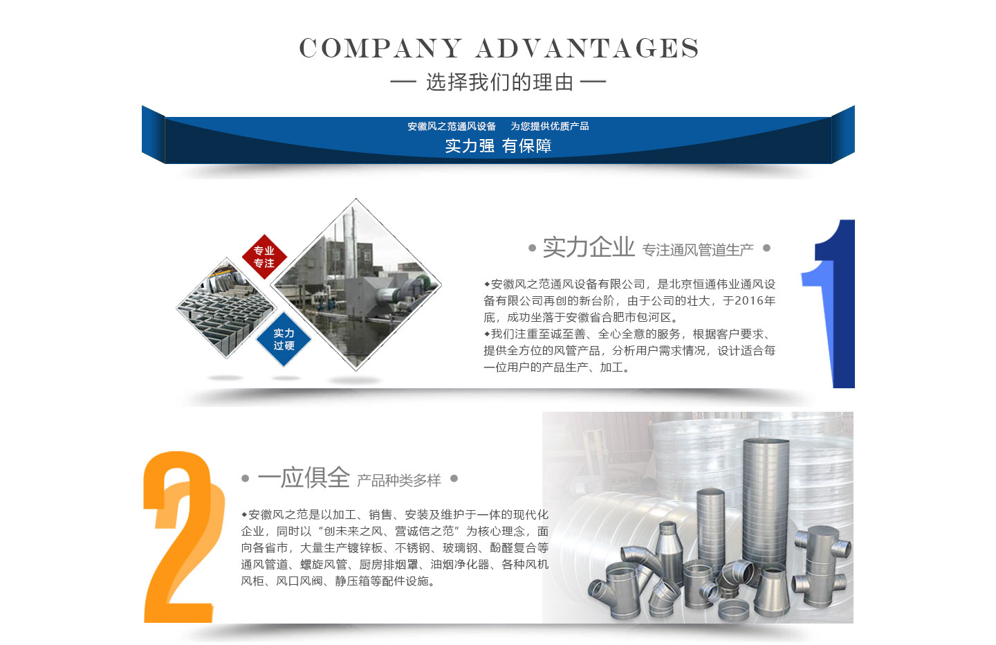 安徽風之范通風設備有限公司,是北京恒通偉業通風設備有限公司再創(chuàng)的新臺階,多年來,公司員工憑著“誠信敬業、團結拼搏、勇于開拓、務實進取”的企業精神,先后承接了多項重點工程項目,使公司健康穩(wěn)步發(fā)展?,F由于公司的壯大,業務的拓展,又于2016年底,成功坐落于安徽省合肥市包河區。本公司生產設備精良,技術力量雄厚,質保體系完善!讓用戶體驗到,貼心的服務,無憂的售后!風之范是以加工、銷售、安裝及維護于一體的現代化企業,同時以“創(chuàng)未來之風、營誠信之范”為核心理念,面向全國各省市,大量生產鍍鋅板、不銹鋼、玻璃鋼、酚醛復合等通風管道、螺旋風管、廚房排煙罩、油煙凈化器、各種風機風柜、風口風閥、靜壓箱等配件設施。廣泛承接商場、工廠、酒店、寫字樓、地下室等,消防排煙工程、除塵凈化工程、室內通風工程、暖通空調工程、廚房排煙凈化工程。我們力求上進,追求,歡迎各界人士技術指導,經濟合作,共創(chuàng)美好明天!